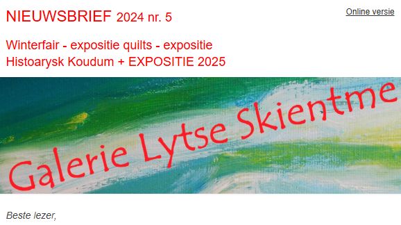 Half november verscheen de vijfde nieuwsbrief van 2024. Met daarin de kunstenaars die we voor onze EXPOSITIE 2025 geselecteerd hebben. Maar ook met een paar uitstapjes: op 30 november en 1 december staat Galerie Lytse Skientme op de Winterfair Koudum, in sporthal De Sândobbe. Van 19 tot 28 december exposeert Modevakschool Bakhuizen in onze galerie met quilts, en daar zijn héél mooie bij. In het nieuwe jaar hebben we van 16 januari tot 15 februari een expositie van Histoarysk Koudum met ‘Koudumer verhalen uit de Tweede Wereldoorlog’. Lees de vijfde nieuwsbrief van 2024 hier.