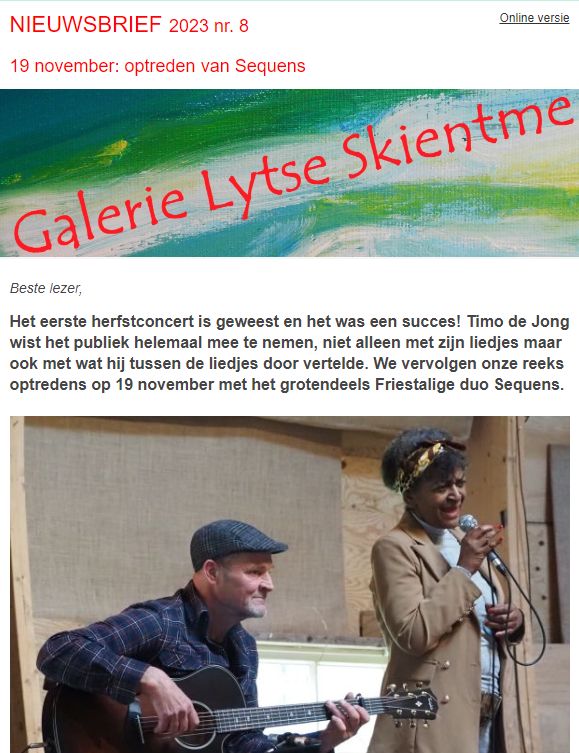 Op 31 oktober verscheen de zevende nieuwsbrief van 2022 van Galerie Lytse Skientme, met nieuws over de herfst- en winterconcerten. Op 9 oktober was het eerste herfstconcert met Act of Mutiny en dat was na tweeëneenhalf jaar weer heerlijk om mee te maken. Het volgende herfstconcert vindt plaats op zondagmiddag 13 november, dan treedt het duo Hoed en de Rand op. Meer informatie daarover in Nieuwsbrief 2022-7