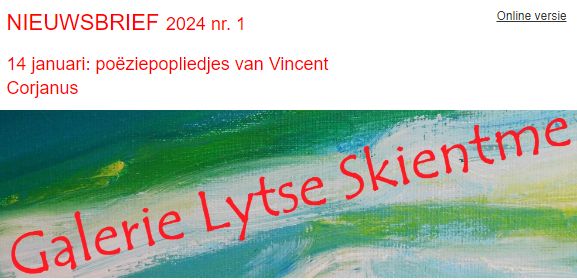 Begin januari is de eerste nieuwsbrief van 2024 verschenen. Daarin de nieuwe plannen voor de galerie, de aankondiging voor het intieme concert met de poëziepopliedjes van Vincent Corjanus op 14 januari en de expositie van Histoarysk Koudum in onze galerie van half januari tot half februari. Klik hier voor de online-versie van deze nieuwsbrief,