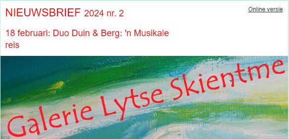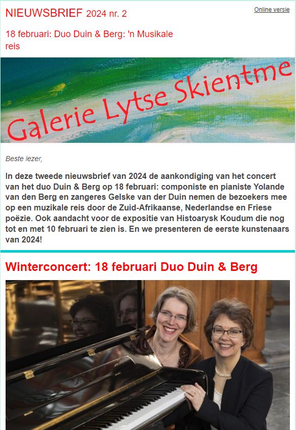 Begin februari is de tweede nieuwsbrief van 2024 verschenen. Daarin worden enkele kunstenaars van 2024 voorgesteld en er is natuurlijk de aankondiging voor het optreden van het duo Duin & Berg op 18 februari. Plus een terugblik op de expositie van Histoarysk Koudum die in onze galerie van half januari tot half februari te zien was. Klik hier voor de online-versie van deze nieuwsbrief.