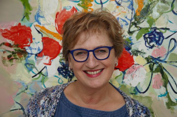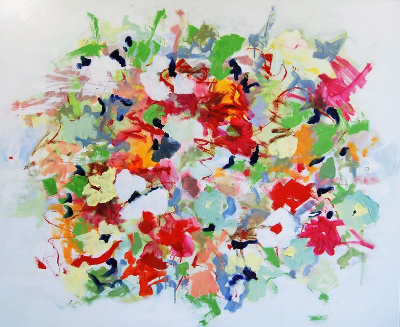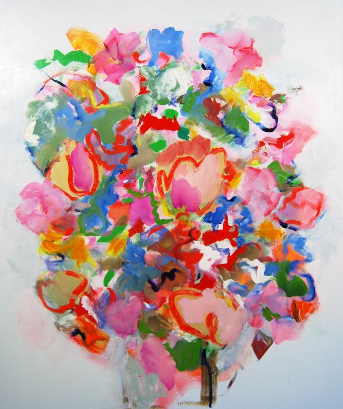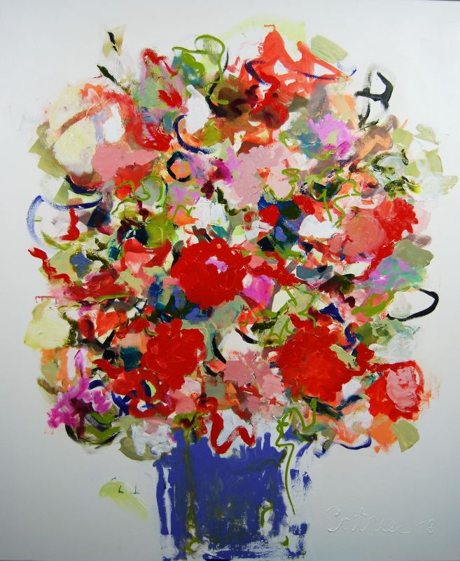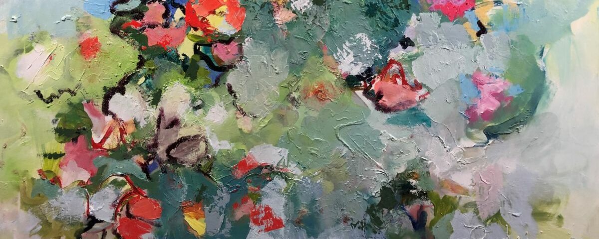Kleur en warmte zijn dan ook de in het oog springende kenmerkende van de grote doeken die ze in het voorjaar van 2020 in galerie Lytse Skientme exposeert. De kleuren zoekt ze voelend en tastend uit en spat ze spontaan op het doek. Daarna kijkt ze het doek af, met veel geduld, om het uiteindelijk af te kunnen werken. Steeds terugkerend zijn de karakteristieke bloemvormen die in haar ontwikkeling steeds abstracter worden.