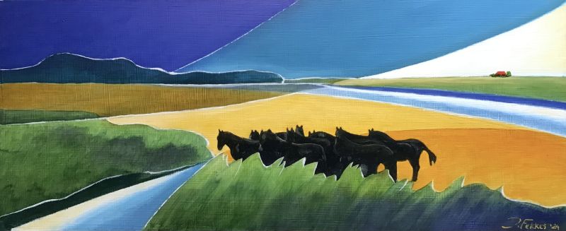 De Koudumer schilder Jentsje Fekkes exposeerde al vaker in Galerie Lytse Skientme en we blijven een grote fan van zijn werk. Hij is geleidelijk overgegaan van realistisch naar een meer geabstraheerde uitwerking met intensere kleuren, lijnen en vlakken. Zijn inspiratiebron blijft zijn eigen omgeving en dat zijn dan vaak landschappelijke elementen, de kleuren van glas in lood en de klanken van muziek die vaak vanuit zichzelf ook weer kleur uitdragen.