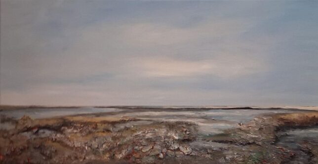 De liefde van de in Hurdegaryp wonende schilderes Joke Ket gaat vooral uit naar het Wad met aan de horizon de eilanden. Het Wad biedt schoonheid, uitzichten en de sensatie van zout op je lippen, voeten in het slik en zand op je lijf. Wadvondsten, zoals schelpen, slik en zeewier, verwerkt ze in haar schilderijen. Dat geeft de schilderijen niet alleen een aparte structuur, het maakt ze ook letterlijk voelbaarder. Naast Wadschilderijen hebben we trouwens ook altijd een aantal kleine Wadvensters van Joke Ket op voorraad.
