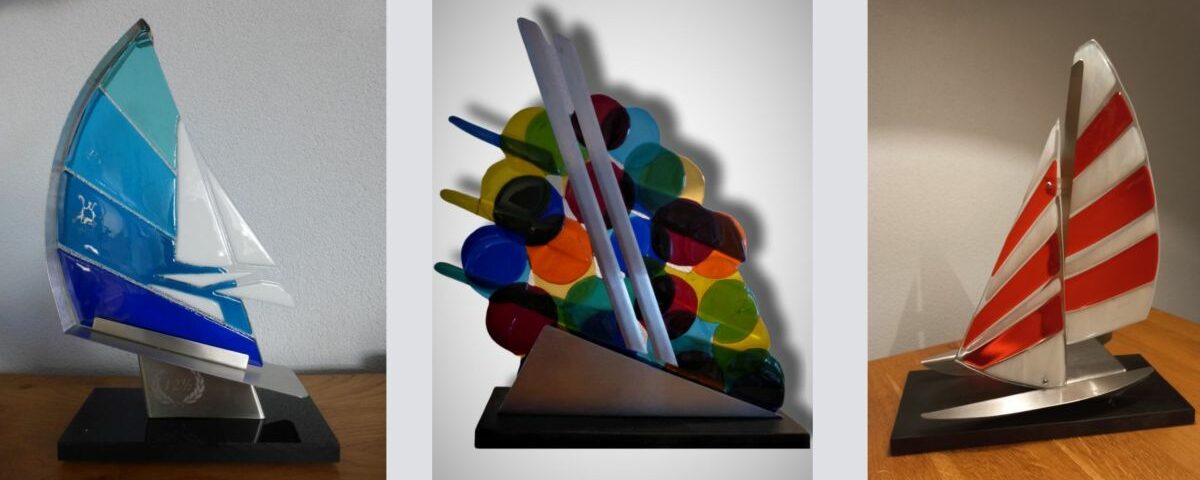 Ook de standaards waarop de objecten staan, maakt hij zelf, waardoor het geheel mooi op elkaar afgestemd is. Hoewel hij soms figuratief werkt, maakt Henk van der Vegt het liefst abstracte ontwerpen. Vaak gaat het om de kleuren waar het licht doorheen speelt. Omdat Koudum zich midden in een watersportgebied bevindt, heeft Van der Vegt zich voor de expositie in Galerie Lytse Skientme voor een deel van de te exposeren voorwerpen laten inspireren door het thema watersport.