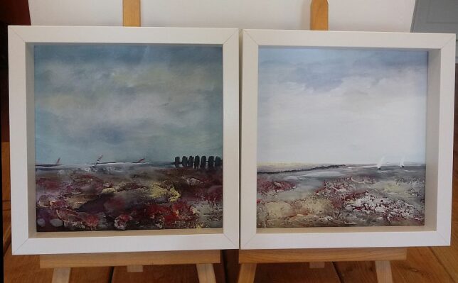 Sinds Joke Ket in 2017 in Galerie Lytse Skientme haar Waddenschilderijen exposeerde, hebben we van haar zogenaamde Wadvensters op voorraad. Een Wadvenster is een stukje Waddengebied in miniatuur: mixed media (waaronder Waddenslik en acryl) op papier in een eenvoudige lijst (27×27 cm). Een unieke manier om voor een spotprijs de Wadden ook thuis te beleven of cadeau te geven natuurlijk.