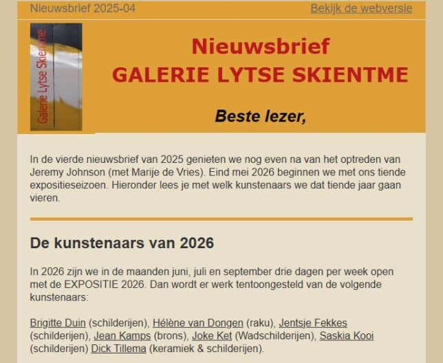 Eind oktober verscheen de vierde nieuwsbrief van 2025. Daarin onder andere de namen van de kunstenaars die in 2026 komen exposeren. Lees hier de nieuwsbrief.