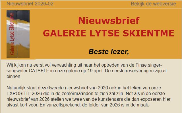 De tweede nieuwsbrief van 2026 van Galerie Lytse Skientme is verschenen. Met daarin de aankondiging van het bijzondere optreden van de Finse CATSELF op 19 april in onze galerie en natuurljik aandacht voor de EXPOSITIE 2026. Een webversie van de nieuwsbrief is hier te bekijken.