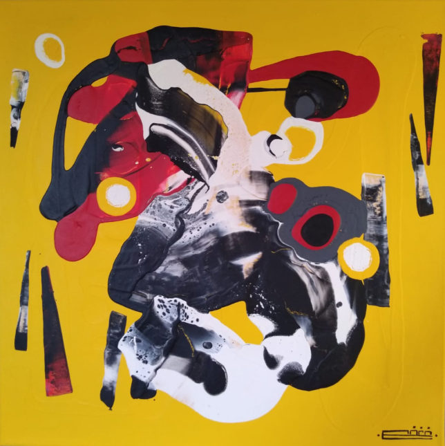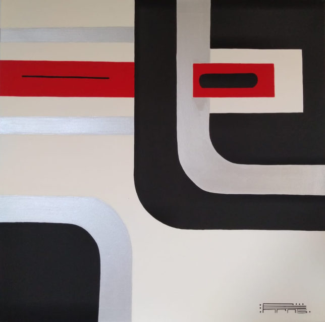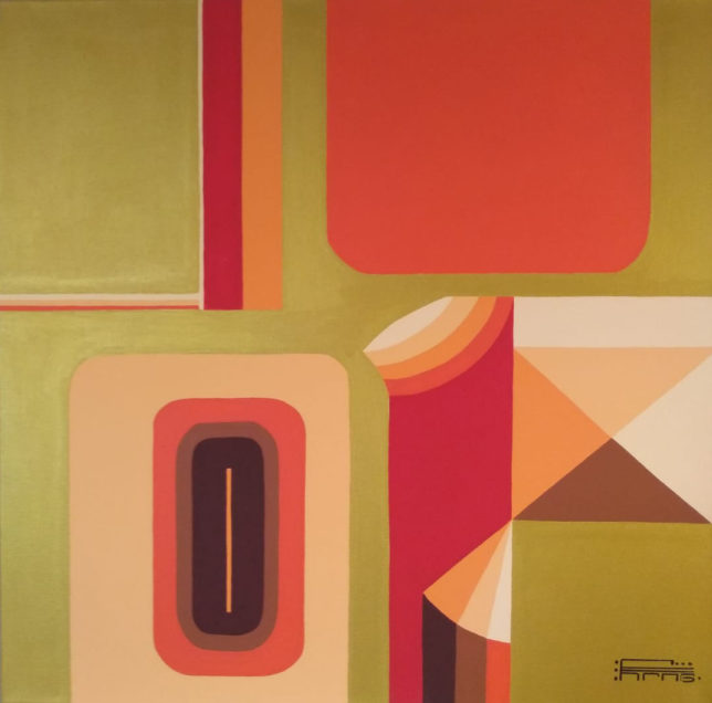 The richness of this inner world is clearly visible in the abstract works he shows in Galerie Lytse Skientme. Some of these paintings are made up of multicolored geometric shapes: triangles and rectangles, sometimes with rounded corners. The painter creatively constructs these shapes on canvas into a colorful and fascinating painting.