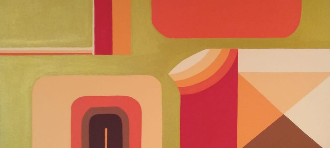 Hoe rijk die binnenwereld is, is goed te zien aan de abstracte werken die hij laat zien in Galerie Lytse Skientme. Een deel van die schilderijen is opgebouwd uit veelkleurige geometrische vormen: driehoeken en rechthoeken, soms met afgeronde hoeken. Op creatieve manier construeert de schilder deze vormen op een doek tot een kleurrijk en boeiend schilderij.